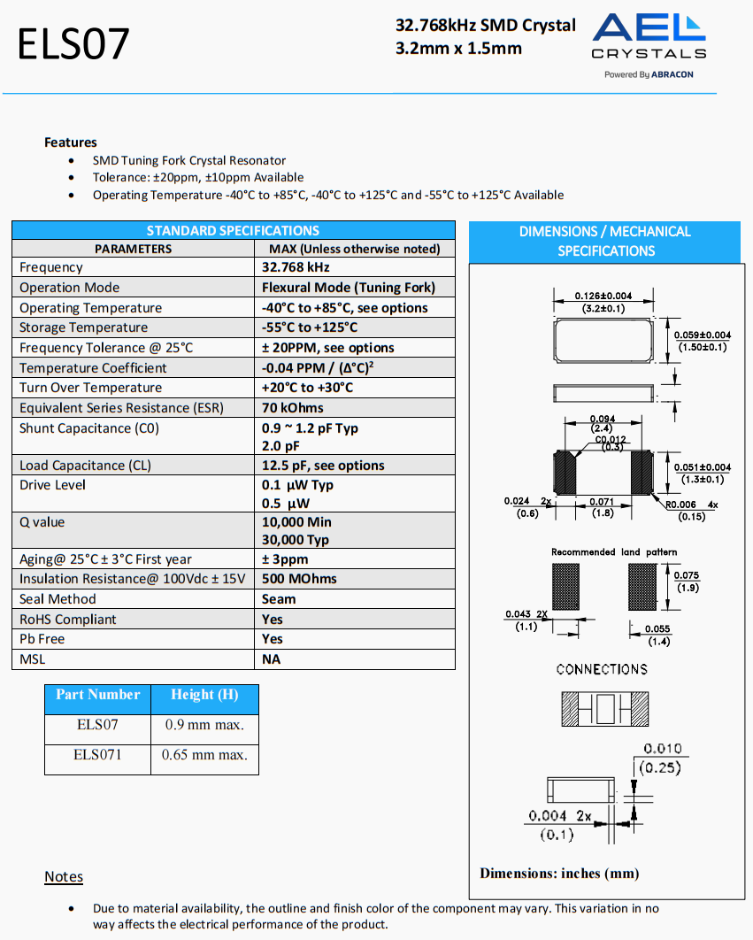 | ELS07-32.768kHz-6-T | AEL Crystals | ELS07 | 32.768 kHz | 0 | ±20ppm | 6 pF |