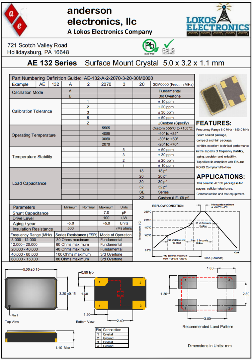 安德森進(jìn)口無源晶振,AE132汽車大燈晶振,AE-132-A-2-2070-3-20-30M0000高品質(zhì)晶振,美國安德森晶振公司,Anderson晶振,AE-132晶振,無源晶振,貼片晶振,7050晶振,高精度晶振,高品質(zhì)晶振,美國晶振,進(jìn)口晶振,低損耗晶振,高質(zhì)量晶振,通訊設(shè)備晶振,路由器晶振,石英晶振,產(chǎn)品具有高精度超小型的表面貼片型石英晶體振蕩器,最適用于移動通信終端的基準(zhǔn)時鐘等移動通信領(lǐng)域.比如智能手機(jī),無線通信,衛(wèi)星導(dǎo)航,平臺基站等較高端的數(shù)碼產(chǎn)品,晶振本身小型,薄型具備各類移動通信的基準(zhǔn)時鐘源用頻率,貼片晶振具有優(yōu)良的電氣特性,耐環(huán)境性能適用于移動通信領(lǐng)域,滿足無鉛焊接的高溫回流溫度曲線要求,符合RoHS/無鉛。