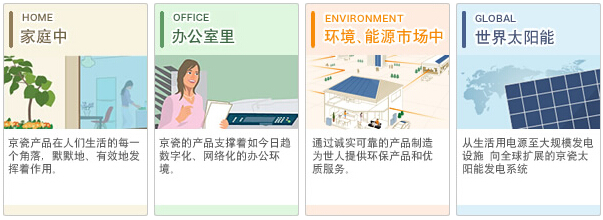 家庭、辦公室、社區(qū)乃至世界各地,京瓷的產(chǎn)品已成為我們生活中不可或缺的一部分.例如,將太陽光轉換成清潔能源的住宅用太陽能發(fā)電系統(tǒng);用于打印機、復印機、電腦等辦公室里各種通信設備相關業(yè)務的電子零部件;豐富社區(qū)溝通的京瓷通信設備相關業(yè)務等,尤其,京瓷新開發(fā)的能源管理系統(tǒng)可以有效控制電耗.從無電地區(qū)到大型太陽能發(fā)電站,京瓷的太陽能發(fā)電系統(tǒng)產(chǎn)生的清潔能源發(fā)揮著積極重要的作用.京瓷將通過各種高品質產(chǎn)品,為提高人們的生活水平做出貢獻.