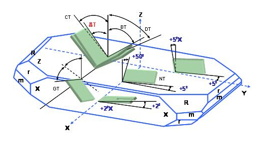 依據(jù)不同的應(yīng)用領(lǐng)域及工作溫度需求, 因應(yīng)了許多不同的石英切割角度種類. 例如AT-, BT-, CT-, DT-, NT, GT…..等不同的切割板片. 不同的切割方向的板片具有不同的彈性常數(shù)張量(elastic constant tensor), 不同的壓電常數(shù)張量(piezoelectric constant tensor)及不同的介電常數(shù)張量(dielectric constant tensor). 這些張量在石英組件的設(shè)計及應(yīng)用上展現(xiàn)了不同的振蕩及溫度特性. (圖中)表現(xiàn)了在Z-plat石英結(jié)構(gòu)上,幾種不同方向的石英板片切割方式.