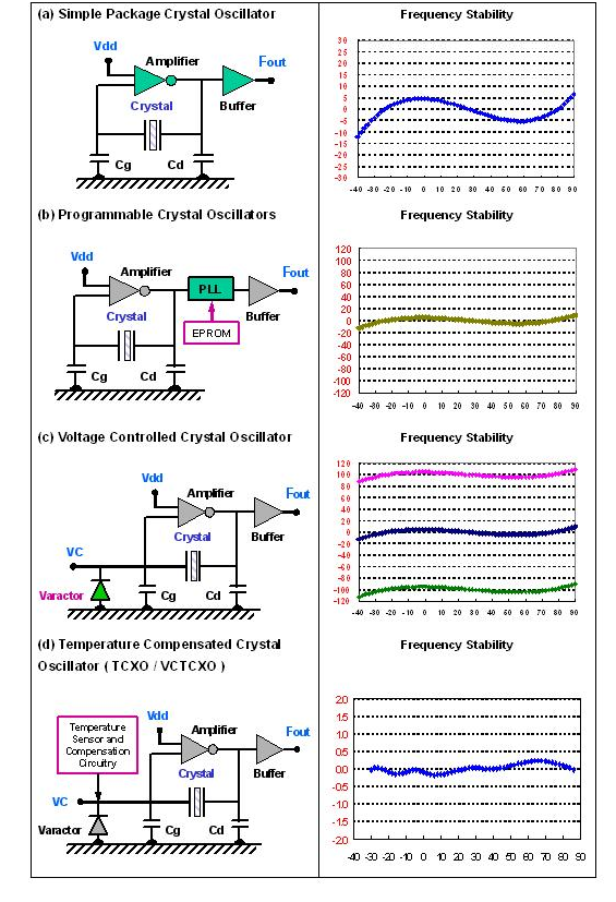 當(dāng)把石英共振子與振蕩線路或集成電路(IC)一起整合在一個封裝內(nèi), 由外部提供電源電壓, 形成一個主動組件輸出頻率信號, 就是所謂的石英晶體振蕩器. 石英晶體振蕩器可以藉由單一封裝組件內(nèi)部不同的振蕩線路及輸出線路, 提供不同特性需求的參考頻率(reference frequency). 例如有 石英頻率振蕩器SPXO ( Simple Package Crystal Oscillator ) 或稱為 CXO ( Clock Crystal Oscillator ), 可程序化石英晶體振蕩器PCXO ( Programmable Crystal Oscillator ), 電壓控制石英晶體振蕩器VCXO ( Voltage Controlled Crystal Oscillator ), 溫度補(bǔ)償石英晶體振蕩器TCXO ( Temperature Compensated Crystal Oscillator ) 及 恒溫槽控制石英晶體振蕩器OCXO ( Oven Controlled Crystal Oscillator ).