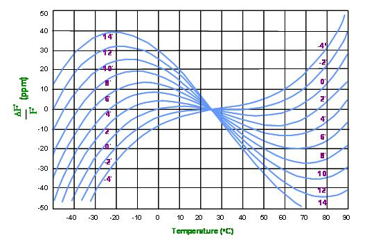(圖2)是以AT切割角度變動(dòng)在厚度振動(dòng)模態(tài)的頻率對(duì)溫度特性的展開圖. 圖中以常用的室溫?cái)z式25度作為相對(duì)零點(diǎn), AT切割的最大優(yōu)點(diǎn)是頻率對(duì)溫度變化為一元三次方曲線. 這個(gè)特性, 從(圖六)中可以看到, 在相當(dāng)寬廣的溫度范圍下, AT切割的溫度曲線的第一階及第二階常數(shù)為零, 第三階的常數(shù)便決定了頻率對(duì)溫度的變化值.,