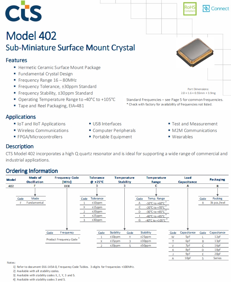 | 402F160XXCLR | CTS晶振 | 402 | MHz Crystal | 16MHz |