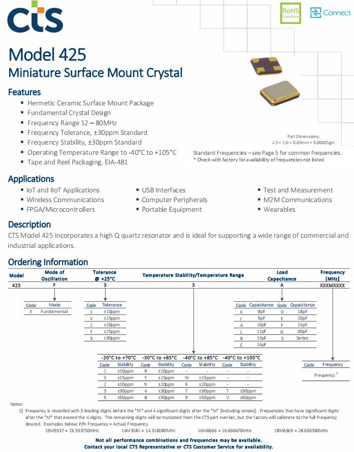 | 425F35E025M0000 | CTS晶振 | 425 | MHz Crystal | 25MHz |