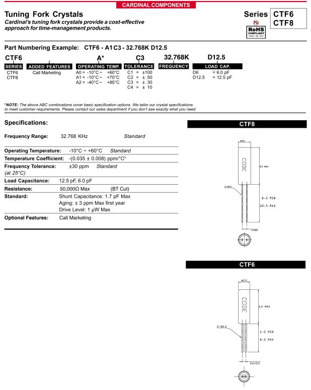 | CTF6-A1C2-32.768KD12.5 | Cardinal晶振 | CTF6 | 32.768kHz | 50 kOhm | -20°C ~ 70°C |