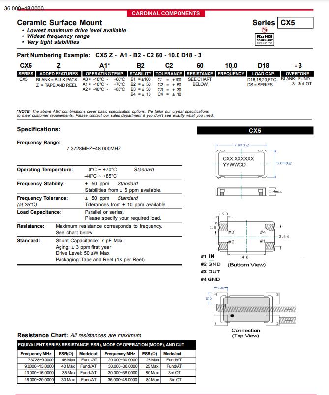 | CX5Z-A1B2C5-40-24.0D18 | Cardinal晶振 | CX5 | 24MHz | 40 Ohm | -10°C ~ 70°C |