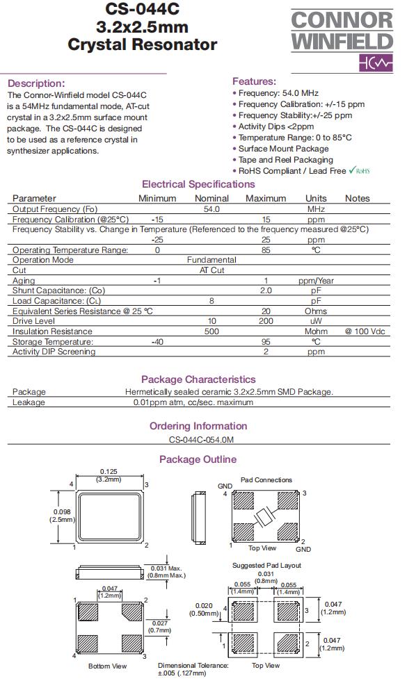 | CS-044-054.0M | Connor-Winfield | CS-044 | 54MHz | ±25ppm | ±15ppm | 8pF | 20 Ohm | -40°C ~ 85°C |