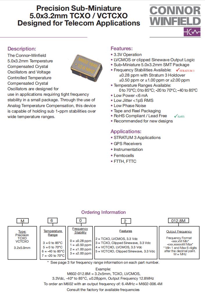 M724-020.0M,進(jìn)口VC-TCXO晶振,6G模塊晶振,美國ConnorWinfield晶振,M72有源晶振,M724-020.0M晶振,5032mm晶振,VC-TCXO晶振,進(jìn)口SMD晶振,LVCMOS輸出晶振,頻率20MHz,電壓3.3V,工作溫度-20~70°C,頻率穩(wěn)定性1ppm,低相位噪聲晶振,高可靠性晶振,6G模塊晶振,第三層應(yīng)用晶振,GPS導(dǎo)航晶振,儀器儀表應(yīng)用晶振,無線網(wǎng)絡(luò)晶振.
