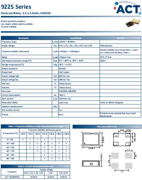 ACT晶振,9225晶振,普通有源晶振.有源晶振,是只晶體本身起振需要外部電壓供應(yīng),起振后可直接驅(qū)動(dòng)CMOS 集成電路,產(chǎn)品本身已實(shí)現(xiàn)與薄型IC(TSSOP封裝,TVSOP封裝)同樣的1mm厚度,斷開(kāi)時(shí)的消費(fèi)電流是15 µA以下,編帶包裝方式可對(duì)應(yīng)自動(dòng)搭載及IR回流焊接(無(wú)鉛對(duì)應(yīng))產(chǎn)品有幾種電壓供選1.8V,2.5V,3V3.3V,5V,以應(yīng)對(duì)不同IC產(chǎn)品需要.