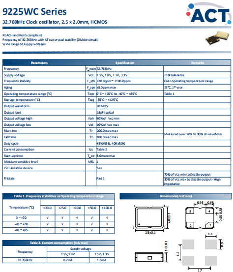 ACT晶振,9225WC晶振,有源晶體振蕩器.貼片晶振本身體積小,超薄型石英晶體振蕩器,特別適用于有目前高速發(fā)展的高端電子數(shù)碼產(chǎn)品,因為晶振本身小型化需求的市場領域,小型,薄型是對應陶瓷振蕩器(偏差大)和普通的石英晶體振蕩器(偏差小)的中間領域的一種性價比較出色的產(chǎn)品.產(chǎn)品廣泛用于筆記本電腦,無線電話,衛(wèi)星導航HDD, SSD, USB, Blu-ray等用途,符合無鉛焊接的高溫回流焊曲線特性.