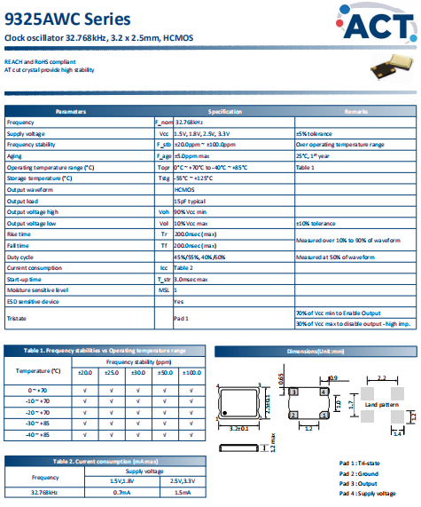 ACT晶振,9325AWC晶振,石英晶體振蕩器.3225mm體積的晶振,可以說(shuō)是目前小型數(shù)碼產(chǎn)品的福音,目前超小型的智能手機(jī)里面所應(yīng)用的就是小型的石英晶振,該產(chǎn)品最適用于無(wú)線(xiàn)通訊系統(tǒng),無(wú)線(xiàn)局域網(wǎng),已實(shí)現(xiàn)低相位噪聲,低電壓,低消費(fèi)電流和高穩(wěn)定度,超小型,質(zhì)量輕等產(chǎn)品特點(diǎn),產(chǎn)品本身編帶包裝方式,可對(duì)應(yīng)自動(dòng)高速貼片機(jī)應(yīng)用,以及高溫回流焊接(產(chǎn)品無(wú)鉛對(duì)應(yīng)),為無(wú)鉛產(chǎn)品.