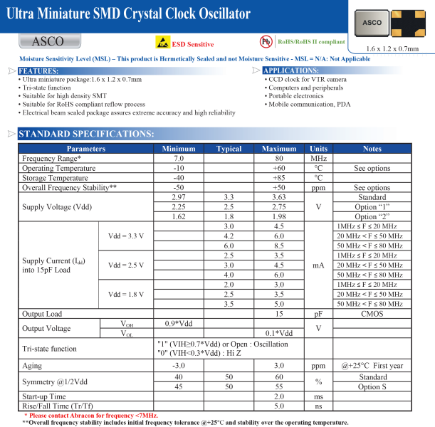 ABRACON晶振,ASCO-12.000MHZ-EK-T3晶振,ASCO晶振,有源晶體振蕩器.有源晶振,是只晶體本身起振需要外部電壓供應(yīng),起振后可直接驅(qū)動(dòng)CMOS 集成電路,產(chǎn)品本身已實(shí)現(xiàn)與薄型IC(TSSOP封裝,TVSOP封裝)同樣的1mm厚度,斷開(kāi)時(shí)的消費(fèi)電流是15 µA以下,編帶包裝方式可對(duì)應(yīng)自動(dòng)搭載及IR回流焊接(無(wú)鉛對(duì)應(yīng))產(chǎn)品有幾種電壓供選1.8V,2.5V,3V3.3V,5V,以應(yīng)對(duì)不同IC產(chǎn)品需要.