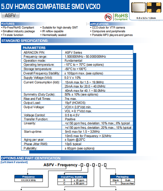 ABRACON晶振,ASFV晶振,VCXO振蕩器.普通貼片石英晶振外觀使用金屬材料封裝的,具有高穩(wěn)定性,高可靠性的石英晶體振蕩器,晶振外觀本身使用金屬封裝,充分的密封性能,可確保其高可靠性,采用編帶包裝,外包裝采用朔膠盤,可在自動貼片機(jī)上對應(yīng)自動貼裝等優(yōu)勢.