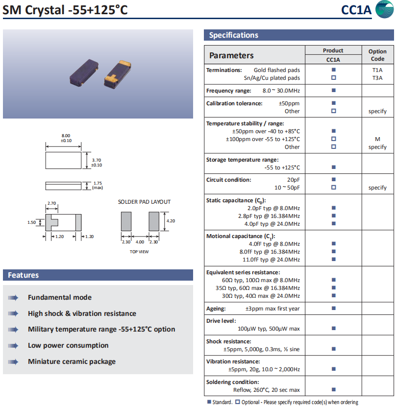 Golledge晶振,CC1A晶振,貼片石英晶體.石英貼片晶振,體積小,焊接可采用自動貼片系統(tǒng),產(chǎn)品本身小型,表面貼片晶振,特別適用于有小型化要求的電子數(shù)碼產(chǎn)品市場領(lǐng)域,因產(chǎn)品小型,薄型優(yōu)勢,耐環(huán)境特性,包括耐高溫,耐沖擊性等,在移動通信領(lǐng)域得到了廣泛的應(yīng)用,晶振產(chǎn)品本身可發(fā)揮優(yōu)良的電氣特性,滿足無鉛焊接的高溫回流溫度曲線要求.