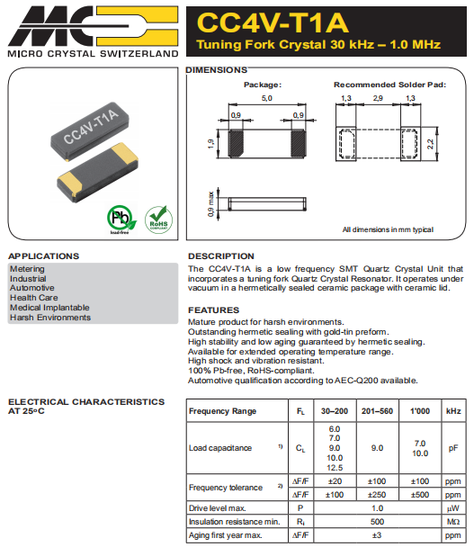 Microcrystal晶振,CC4V-T1A-32.768kHz-12.5pF-20PPM-TA-QC晶振,CC4V-T1A晶振,無(wú)鉛環(huán)保晶體.貼片石英晶體,體積小,焊接可采用自動(dòng)貼片系統(tǒng),產(chǎn)品本身小型,表面貼片晶振,特別適用于有小型化要求的電子數(shù)碼產(chǎn)品市場(chǎng)領(lǐng)域,因產(chǎn)品小型,薄型優(yōu)勢(shì),耐環(huán)境特性,包括耐高溫,耐沖擊性等,在移動(dòng)通信領(lǐng)域得到了廣泛的應(yīng)用,晶振產(chǎn)品本身可發(fā)揮優(yōu)良的電氣特性,滿(mǎn)足無(wú)鉛焊接的高溫回流溫度曲線(xiàn)要求.