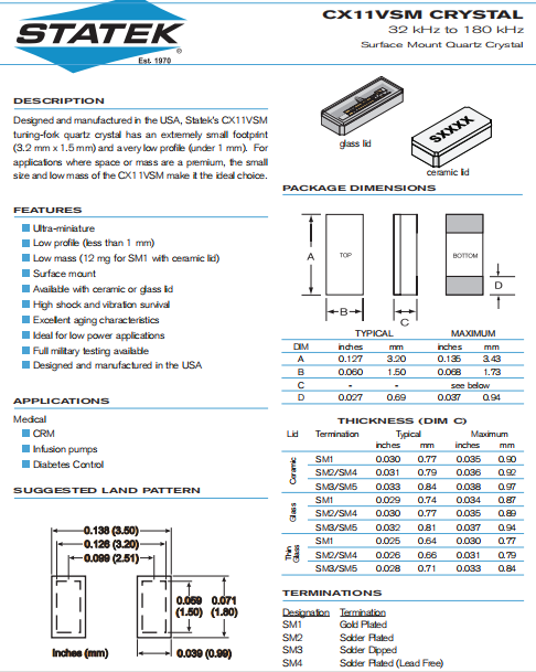 Statek晶振,CX11VSM晶振,無(wú)源環(huán)保晶振.小型貼片石英晶振,外觀尺寸具有薄型表面貼片型石英晶體諧振器,特別適用于有小型化要求的市場(chǎng)領(lǐng)域,比如智能手機(jī),無(wú)線藍(lán)牙,平板電腦等電子數(shù)碼產(chǎn)品.晶振本身超小型,薄型,重量輕,晶體具有優(yōu)良的耐環(huán)境特性,如耐熱性,耐沖擊性,在辦公自動(dòng)化,家電相關(guān)電器領(lǐng)域及Bluetooth,WirelessLAN等短距離無(wú)線通信領(lǐng)域可發(fā)揮優(yōu)良的電氣特性,滿足無(wú)鉛焊接的回流溫度曲線要求.
