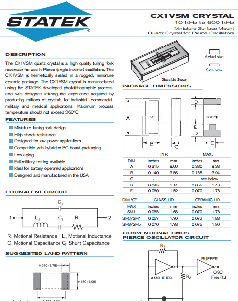 | Statek晶振 | 單位 | CX1VSM晶振 | 石英晶振基本條件 |