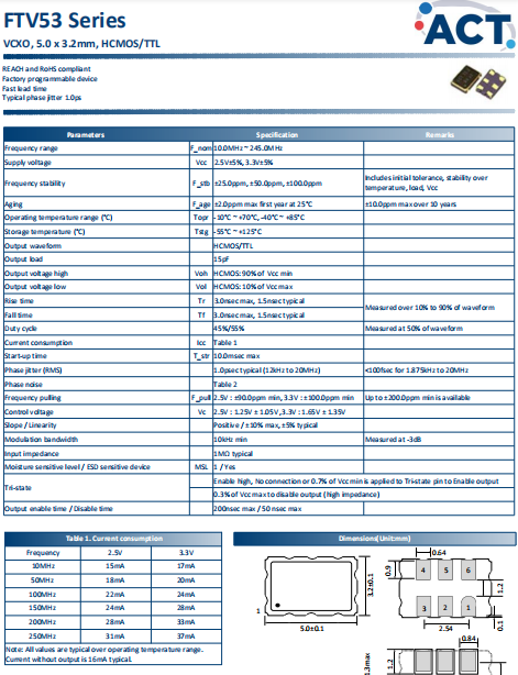 ACT晶振,FTV53晶振,VCXO晶體振蕩器.小型SMD有源晶振,從最初超大體積到現(xiàn)在的7050mm,6035mm,5032mm,3225mm,2520mm體積,有著翻天覆地的改變,體積的變小也使產(chǎn)品帶來了更高的穩(wěn)定性能,接縫密封石英晶體振蕩器,精度高,覆蓋頻率范圍寬的特點,SMD高速自動安裝和高溫回流焊設(shè)計,Optionable待機輸出三態(tài)輸出功能,電源電壓范圍:1.8V?5 V,高穩(wěn)定性,低抖動,低功耗,主要應(yīng)用領(lǐng)域:無線通訊,高端智能手機,平板筆記本W(wǎng)LAN,藍牙,數(shù)碼相機,DSL和其他IT產(chǎn)品的晶振應(yīng)用,三態(tài)功能,PC和LCDM等高端數(shù)碼領(lǐng)域,符合RoHS/無鉛.