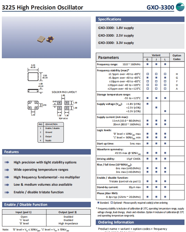 Golledge晶振,GXO-3300晶振,CMOS振蕩器.3225mm體積貼片晶振適用于消費電子領(lǐng)域的表面貼片型石英晶振,本產(chǎn)品已被確定的高信賴性適合用于汽車電子部件,晶體在嚴酷的環(huán)境條件下也能發(fā)揮穩(wěn)定的起振特性,晶振本身具有耐熱,耐振,耐沖擊等優(yōu)良的耐環(huán)境特性,滿足無鉛焊接的高溫回流溫度曲線要求,符合AEC-Q200認證.