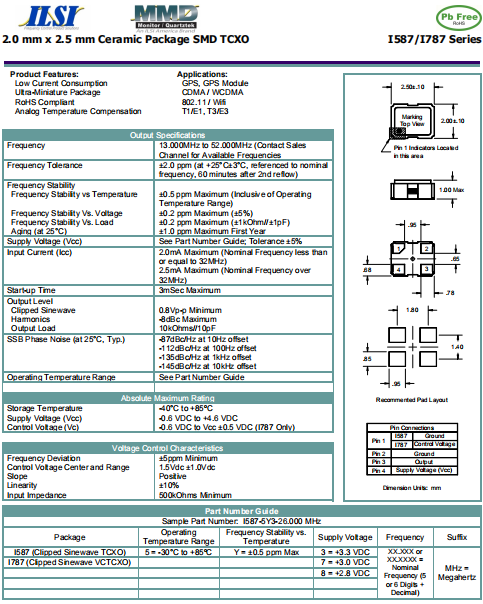 ILSI晶振,I787晶振,VC-TCXO晶振.具有最適合于移動通信設(shè)備用途的高穩(wěn)定的頻率溫度特性.為對應(yīng)低電源電壓的產(chǎn)品.(可對應(yīng)DC +1.8 V±0.1 V to +3.2 V±0.1 V )高度:最高1.0 mm,體積:0.007 cm3,重量:0.024g,超小型,輕型.低消耗電流,表面貼片型產(chǎn)品.(可對應(yīng)回流焊) 無鉛產(chǎn)品.滿足無鉛焊接的回流溫度曲線要求.