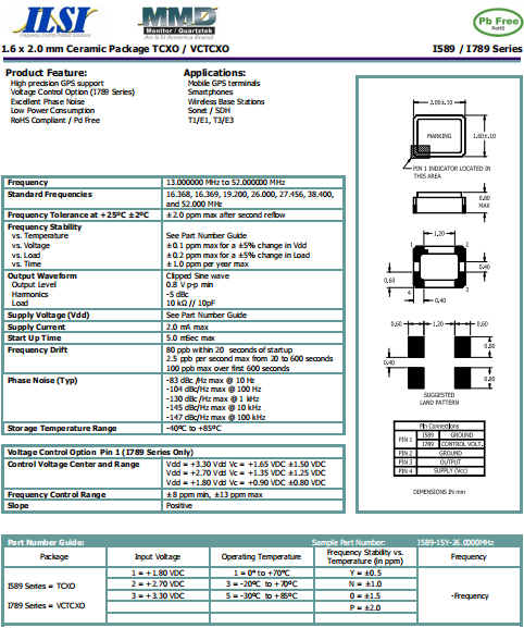 ILSI晶振,I789晶振,壓控溫補(bǔ)晶體振蕩器.智能手機(jī)晶振,產(chǎn)品具有高精度超小型的表面貼片型石英晶體振蕩器,最適用于移動通信終端的基準(zhǔn)時鐘等移動通信領(lǐng)域.比如智能手機(jī),無線通信,衛(wèi)星導(dǎo)航,平臺基站等較高端的數(shù)碼產(chǎn)品,晶振本身小型,薄型具備各類移動通信的基準(zhǔn)時鐘源用頻率,貼片晶振具有優(yōu)良的電氣特性,耐環(huán)境性能適用于移動通信領(lǐng)域,滿足無鉛焊接的高溫回流溫度曲線要求.