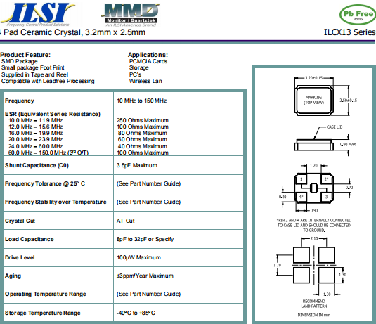 ILSI晶振,ILCX13晶振,無源環(huán)保晶體.3225mm體積非常小的SMDcrystal器件,是民用小型無線數(shù)碼產(chǎn)品的最佳選擇,小體積的環(huán)保晶振被廣泛應(yīng)用到,手機(jī)藍(lán)牙,GPS定位系統(tǒng),無線通訊集,高精度和高頻率的穩(wěn)定性能,非常好的減少電磁干擾的影響,是民用無線數(shù)碼產(chǎn)品最好的選擇,符合RoHS/無鉛.