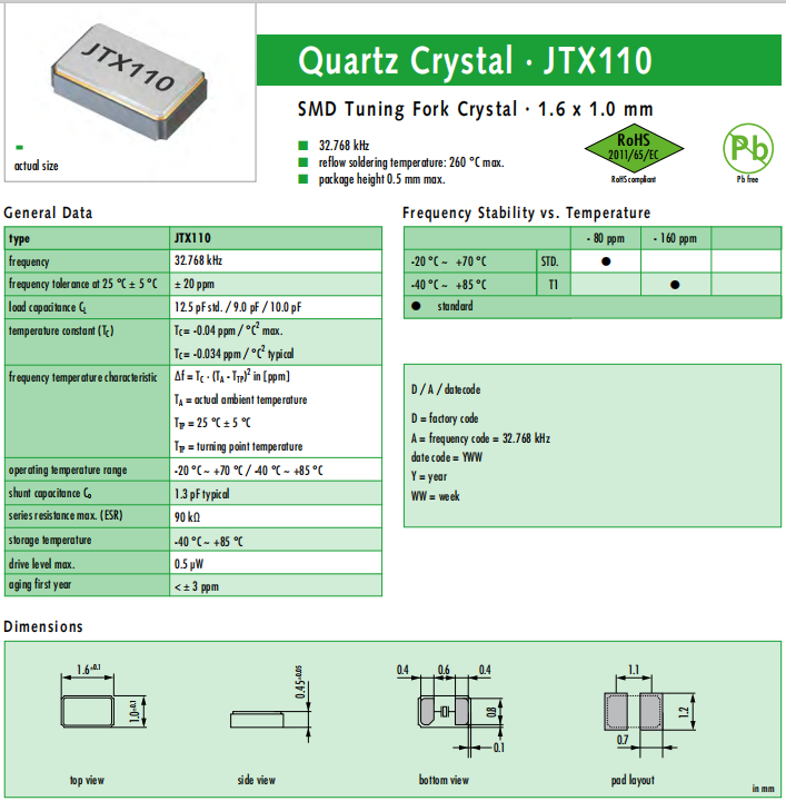 JAUCH晶振,JTX110晶振,無源環(huán)保晶體.小型貼片石英晶振,外觀尺寸具有薄型表面貼片型石英晶體諧振器,特別適用于有小型化要求的市場領(lǐng)域,比如智能手機(jī),無線藍(lán)牙,平板電腦等電子數(shù)碼產(chǎn)品.晶振本身超小型,薄型,重量輕,晶體具有優(yōu)良的耐環(huán)境特性,如耐熱性,耐沖擊性,在辦公自動化,家電相關(guān)電器領(lǐng)域及Bluetooth,WirelessLAN等短距離無線通信領(lǐng)域可發(fā)揮優(yōu)良的電氣特性,滿足無鉛焊接的回流溫度曲線要求.
