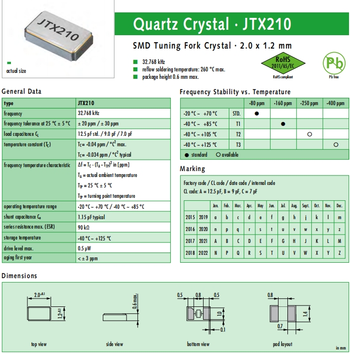 JAUCH晶振,JTX210晶振,石英晶體諧振器.32.768K系列具有超小型,薄型,質(zhì)地輕的表面貼片音叉型石英晶體諧振器,晶振產(chǎn)品本身具備優(yōu)良的耐熱性,耐環(huán)境特性,在辦公自動化,家電領(lǐng)域,移動通信領(lǐng)域可發(fā)揮優(yōu)良的電氣特性,符合無鉛標(biāo)準(zhǔn),滿足無鉛焊接的回流溫度曲線要求,金屬外殼的石英晶振使得產(chǎn)品在封裝時能發(fā)揮比陶瓷晶振外殼更好的耐沖擊性能.