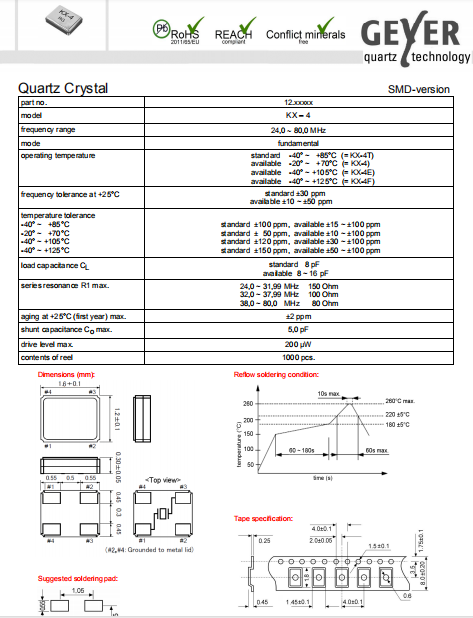 Geyer晶振,KX-4晶振,低功耗環(huán)保晶體.小型表面貼片晶振型,是標(biāo)準(zhǔn)的石英晶體諧振器,適用于寬溫范圍的電子數(shù)碼產(chǎn)品,家電電器及MP3,MP4,播放器,單片機(jī)等領(lǐng)域.可對應(yīng)24.000MHz以上的頻率,在電子數(shù)碼產(chǎn)品,以及家電相關(guān)電器領(lǐng)域里面發(fā)揮優(yōu)良的電氣特性,滿足無鉛焊接的回流溫度曲線要求.
