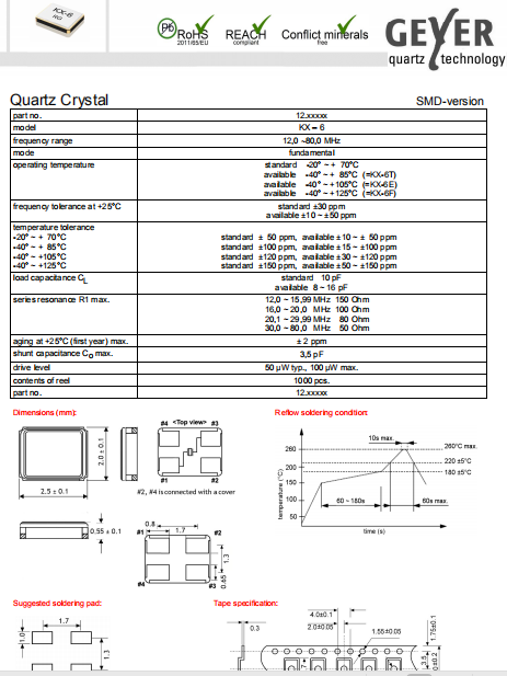 Geyer晶振,KX-6晶振,SMD石英晶體諧振器.普通石英晶振,外觀完全使用金屬材料封裝的,產(chǎn)品本身采用全自動(dòng)石英晶體檢測(cè)儀,以及跌落,漏氣等苛刻實(shí)驗(yàn).產(chǎn)品本身具有高穩(wěn)定性,高可靠性的石英晶體諧振器,焊接方面支持表面貼裝,外觀采用金屬封裝,具有充分的密封性能,晶振本身能確保其高可靠性,采用編帶包裝,可對(duì)應(yīng)產(chǎn)品應(yīng)用到自動(dòng)貼片機(jī)告訴安裝,滿足無鉛焊接的高溫回流溫度曲線要求.