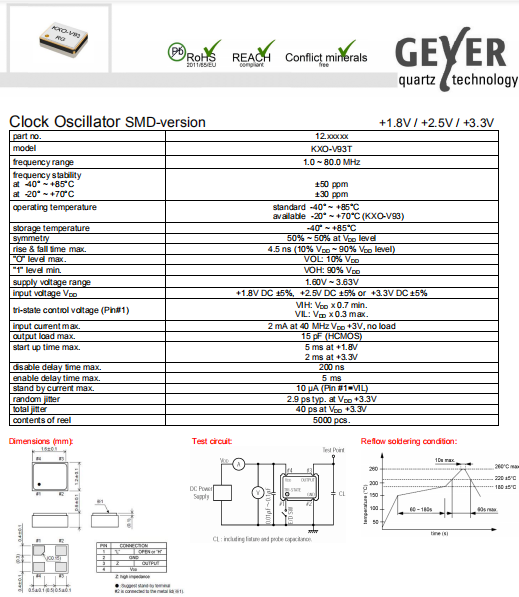 Geyer晶振,KXO-V93T晶振,高質(zhì)量晶體振蕩器.普通貼片石英晶振外觀使用金屬材料封裝的,具有高穩(wěn)定性,高可靠性的石英晶體振蕩器,晶振外觀本身使用金屬封裝,充分的密封性能,可確保其高可靠性,采用編帶包裝,外包裝采用朔膠盤,可在自動貼片機上對應自動貼裝等優(yōu)勢
