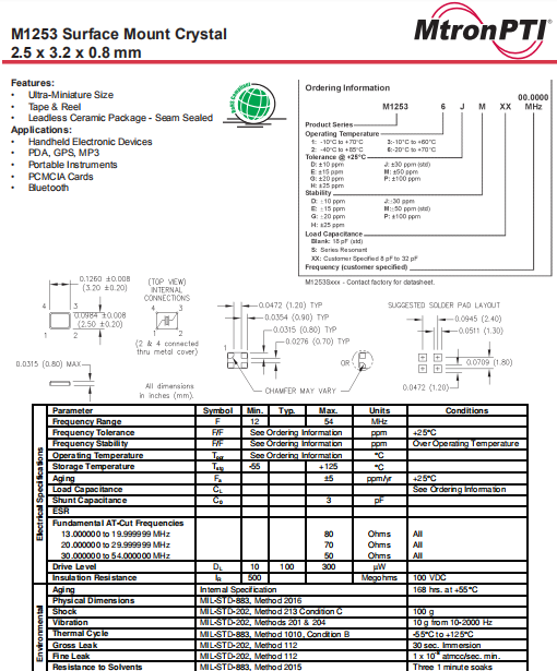 | MTRONPTI晶振 | 單位 | M1253晶振 | 石英晶振基本條件 |