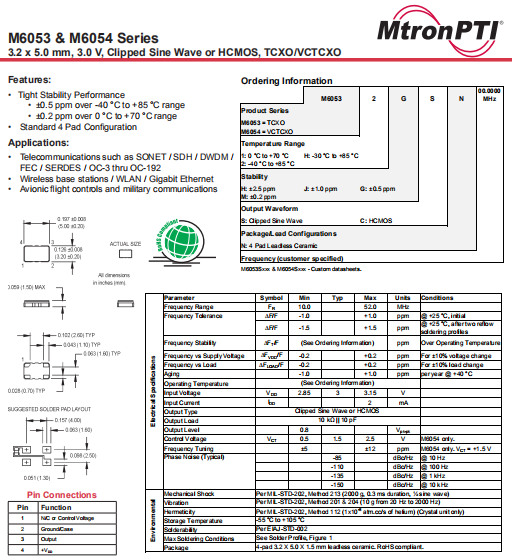 MTRONPTI晶振,M6053晶振,TCXO晶體振蕩器.5032mm體積的石英晶體振蕩器,有源晶振,該產(chǎn)品可驅(qū)動(dòng)2.5V的溫補(bǔ)晶振,壓控晶振,VC-TCXO晶體振蕩器產(chǎn)品,電源電壓的低電耗型,編帶包裝方式,可對(duì)應(yīng)自動(dòng)高速貼片機(jī)自動(dòng)焊接,及IR回流焊接(無鉛對(duì)應(yīng)),為無鉛產(chǎn)品,超小型,質(zhì)地輕.產(chǎn)品被廣泛應(yīng)用到集成電路,程控交換系統(tǒng),無線發(fā)射基站.