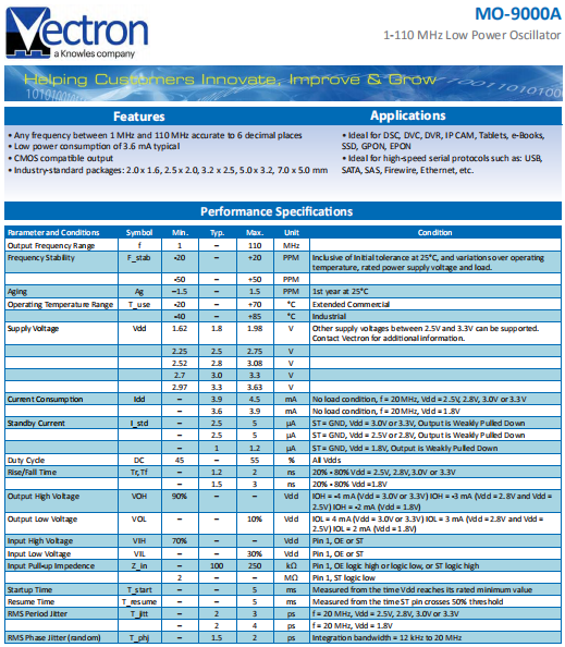 VECTRON晶振,MO-9000A晶振,低電壓振蕩器.小體積貼片2520mm晶振,外觀(guān)小型,表面貼片型晶體諧振器,因本身體積小等優(yōu)勢(shì),適用于移動(dòng)通信終端的基準(zhǔn)時(shí)鐘等移動(dòng)通信領(lǐng)域.小型,薄型,輕型 (2.5 × 2.0 × 0.75mm typ.) 具備優(yōu)良的耐環(huán)境特性及高耐熱性強(qiáng).滿(mǎn)足無(wú)鉛焊接的回流溫度曲線(xiàn)要求.