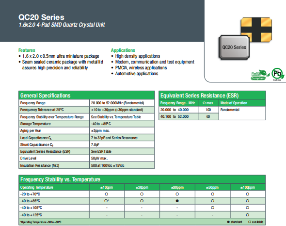 Qantek晶振,QC20晶振,貼片無源晶振.貼片晶振本身體積小,超薄型石英晶體諧振器,特別適用于有目前高速發(fā)展的高端電子數(shù)碼產(chǎn)品,因為晶振本身小型化需求的市場領(lǐng)域,小型,薄型是對應(yīng)陶瓷諧振器(偏差大)和普通的石英晶體諧振器(偏差小)的中間領(lǐng)域的一種性價比較出色的產(chǎn)品.產(chǎn)品廣泛用于筆記本電腦,無線電話,衛(wèi)星導(dǎo)航HDD,SSD,USB,Blu-ray等用途,符合無鉛焊接的高溫回流焊曲線特性.