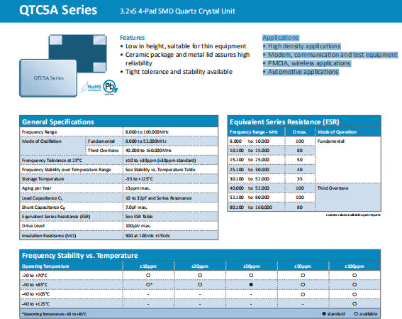 Quarztechnik晶振,QTC5A晶振,高質(zhì)量石英晶體.小體積貼片5032晶振,外觀小型,表面貼片型石英晶體諧振器,因本身體積小等優(yōu)勢(shì),適用于移動(dòng)通信終端的基準(zhǔn)時(shí)鐘等移動(dòng)通信領(lǐng)域.小型,薄型,輕型(5.0×3.2×0.8mmtyp.)具備優(yōu)良的耐環(huán)境特性及高耐熱性強(qiáng).滿(mǎn)足無(wú)鉛焊接的回流溫度曲線(xiàn)要求.
