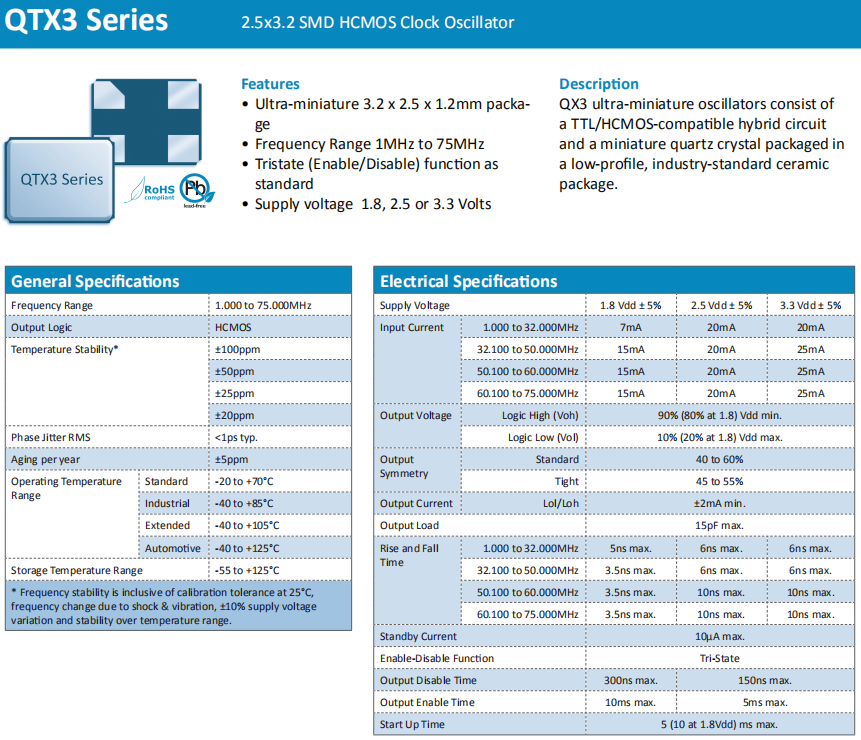 Quarztechnik晶振,QTX3晶振,耐高溫振蕩器.貼片式石英晶體振蕩器,低電壓啟動功率,并且有多種電壓供選擇,比如有1.8V,2.5V,3.3V,3.8V,5V等,產(chǎn)品被廣泛應(yīng)用于,平板筆記本,GPS系統(tǒng),光纖通道,千兆以太網(wǎng),串行ATA,串行連接SCSI,PCI-Express的SDH/SONET發(fā)射基站等領(lǐng)域.符合RoHS/無鉛.