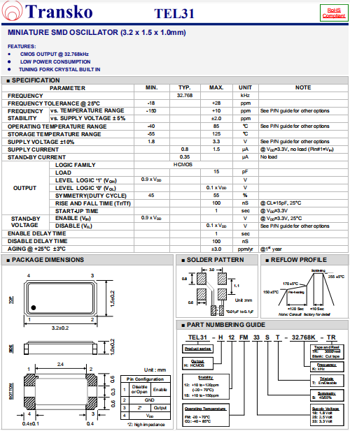 Transko晶振,TEL31晶振,時鐘晶體振蕩器.小體積SMD時鐘晶體振蕩器,是貼片音叉晶體,千赫頻率元件,應用于時鐘模塊,智能手機,全球定位系統(tǒng),因產(chǎn)品本身體積小,SMD編帶型,可應用于高性能自動貼片焊接,被廣泛應用到各種小巧的便攜式消費電子數(shù)碼時間產(chǎn)品,環(huán)保性能符合ROHS/無鉛標準.
