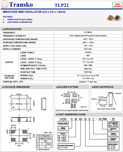 Transko晶振,TLP22晶振,貼片有源晶振.有源晶振,是只晶體本身起振需要外部電壓供應(yīng),起振后可直接驅(qū)動(dòng)CMOS 集成電路,產(chǎn)品本身已實(shí)現(xiàn)與薄型IC(TSSOP封裝,TVSOP封裝)同樣的1mm厚度,斷開時(shí)的消費(fèi)電流是15 µA以下,編帶包裝方式可對(duì)應(yīng)自動(dòng)搭載及IR回流焊接(無(wú)鉛對(duì)應(yīng))產(chǎn)品有幾種電壓供選1.8V,2.5V,3V3.3V,5V,以應(yīng)對(duì)不同IC產(chǎn)品需要.
