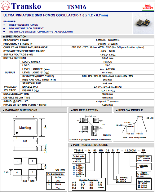 Transko晶振,TSM16晶振,高精度晶振.小體積SMD時(shí)鐘晶體振蕩器,是貼片石英晶振,兆赫頻率元件,應(yīng)用于時(shí)鐘模塊,智能手機(jī),全球定位系統(tǒng),因產(chǎn)品本身體積小,SMD編帶型,可應(yīng)用于高性能自動(dòng)貼片焊接,被廣泛應(yīng)用到各種小巧的便攜式消費(fèi)電子數(shù)碼時(shí)間產(chǎn)品,環(huán)保性能符合ROHS/無鉛標(biāo)準(zhǔn).