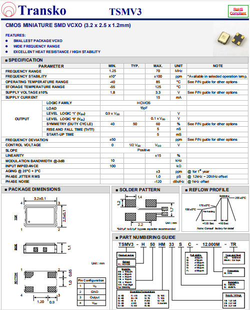 Transko晶振,TSMV3晶振,VCXO晶體振蕩器.普通石英晶振,外觀完全使用金屬材料封裝的,產(chǎn)品本身采用全自動(dòng)石英檢測(cè)儀,以及跌落,漏氣等苛刻實(shí)驗(yàn).產(chǎn)品本身具有高穩(wěn)定性,高可靠性的石英晶體振蕩器,焊接方面支持表面貼裝,外觀采用金屬封裝,具有充分的密封性能,晶振本身能確保其高可靠性,采用編帶包裝,可對(duì)應(yīng)產(chǎn)品應(yīng)用到自動(dòng)貼片機(jī)告訴安裝,滿足無(wú)鉛焊接的高溫回流溫度曲線要求.