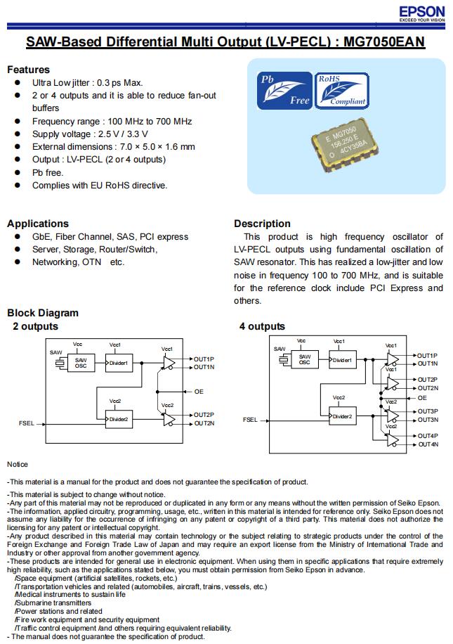| X1M0004110009 | MG7050EAN | 150.000000 MHz | 7.00 x 5.00 x 1.60 mm | LV-PECL | 2.970 to 3.630 V |