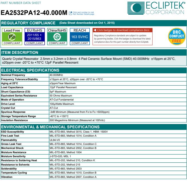ECLIPTEK晶振,EA2532PA12-40.000M晶振,3225mm貼片晶振,超小型表面貼片型SMD晶振,最適合使用在汽車電子領(lǐng)域中,也是特別要求高可靠性的引擎控制用CPU的時(shí)鐘部分.低頻晶振可從7.98MHz起對(duì)應(yīng),小型,超薄型具備強(qiáng)防焊裂性,石英晶體在極端嚴(yán)酷的環(huán)境條件下也能發(fā)揮穩(wěn)定的起振特性,產(chǎn)品本身具有耐熱,耐振,耐撞擊等優(yōu)良的耐環(huán)境特性,滿足無鉛焊接以及高溫回流溫度曲線要求,符合AEC-Q200標(biāo)準(zhǔn).