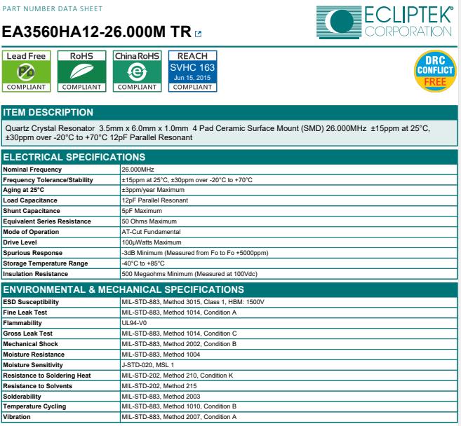 日蝕美國晶振,EA3560HA12-26.000M-TR無線通信晶振,6035mm無源晶體,我們的網(wǎng)站是為了幫助客戶確定黃華產(chǎn)品的RoHS和pb免費狀態(tài)。我們的RoHS/pbfree認證和IPC-1752材料聲明工具為我們的客戶提供了按零件編號處理他們的文檔請求的能力,并在幾秒鐘內收到一個全面的自動回復。