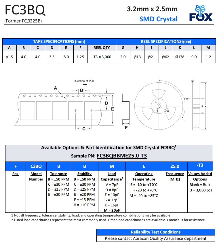 | FC3BQBBME25.0-T1 | Fox晶振 | FC3BQ | 25 MHz | ±50ppm |