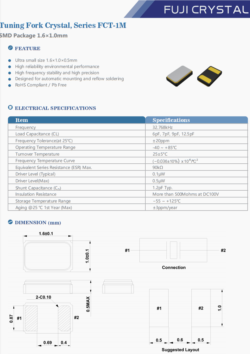 | FCT1M032768C5P1 | Fuji晶振 | FCT-1M | 32.768 kHz | 12.5pF | -10°C ~ 60°C |