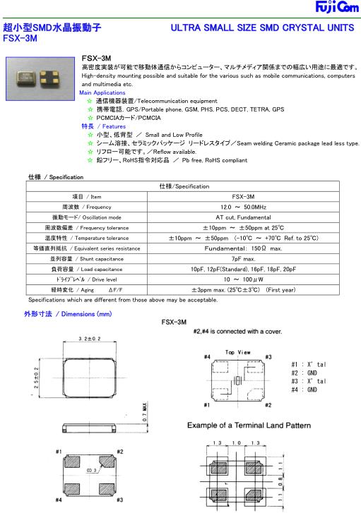 Fujicom晶振,FSX-3M四腳貼片晶振,SMD水晶振動(dòng)子,超小型表面貼片型石英SMD晶振,最適合使用在汽車電子領(lǐng)域中,也是特別要求高可靠性的引擎控制用CPU的時(shí)鐘部分.低頻晶振可從7.98MHz起對(duì)應(yīng),小型,超薄型具備強(qiáng)防焊裂性,石英晶體在極端嚴(yán)酷的環(huán)境條件下也能發(fā)揮穩(wěn)定的起振特性,產(chǎn)品本身具有耐熱,耐振,耐撞擊等優(yōu)良的耐環(huán)境特性,滿足無(wú)鉛焊接以及高溫回流溫度曲線要求,符合AEC-Q200標(biāo)準(zhǔn).