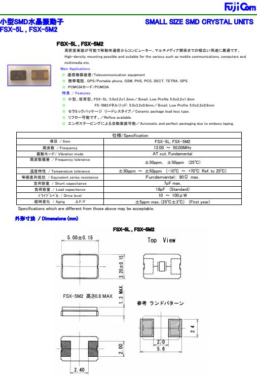進(jìn)口富士晶振,FSX-5L晶振,FSX-5M2石英晶振,GSM專用晶振,小型表面貼片晶振型,是標(biāo)準(zhǔn)的石英晶體振蕩器,適用于寬溫范圍的電子數(shù)碼產(chǎn)品,家電電器及MP3,MP4,播放器,單片機(jī)等領(lǐng)域.可對(duì)應(yīng)8.000MHz以上的頻率,在電子數(shù)碼產(chǎn)品,以及家電相關(guān)電器領(lǐng)域里面發(fā)揮優(yōu)良的電氣特性,滿足無(wú)鉛焊接的回流溫度曲線要求.