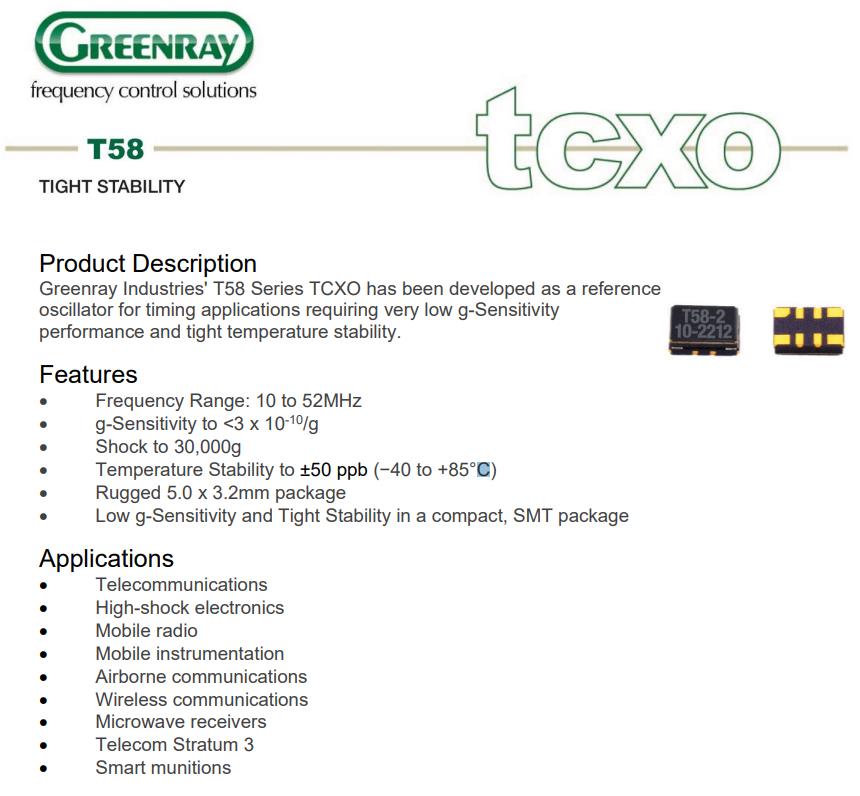 T58-T58-C-LG-48.0MHz-E,TCXO晶振,6G移動無線電晶振,格林雷晶振,T58石英晶體振蕩器,T58-T58-C-LG-48.0MHz-E晶振,5032mm晶振,進口貼片晶振,TCXO晶振,頻率48MHz,電壓3.3V,工作溫度-40~85°C,抗沖擊晶振,高穩(wěn)定性晶振,6G移動無線電晶振,高沖擊電子設備晶振,機載通信晶振,智能彈藥晶振.