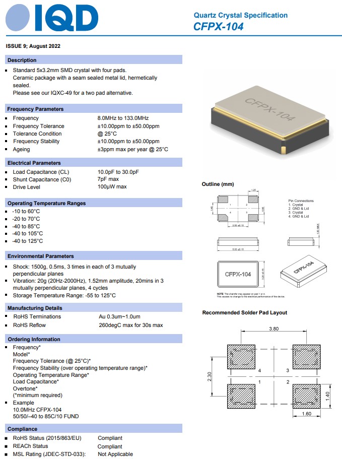 LFXTAL033075REEL,CFPX-104,5032mm,IQD無源晶體,醫(yī)療設(shè)備晶振,參數(shù)表